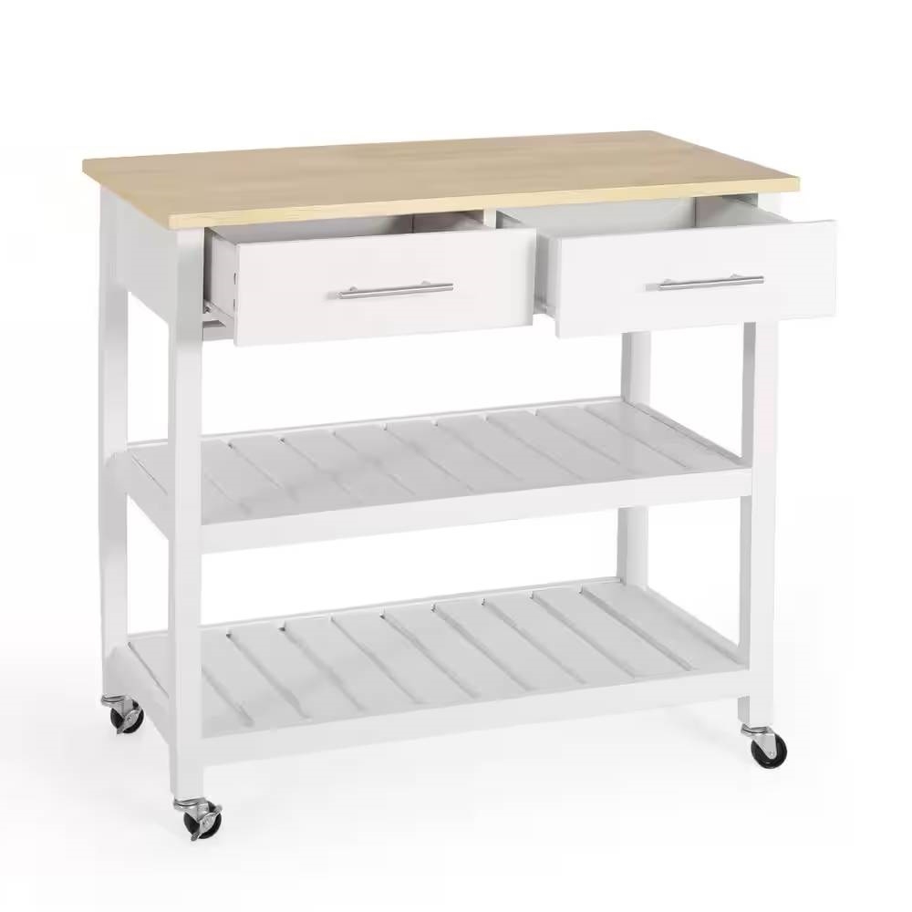 Modern White Kitchen Island Cart with Wood Top 2 Drawers and 2 Bottom Shelves